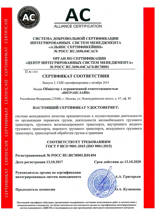 Начиная с октября 2014 года Intransline прошла процедуру одобрения соответствия системы менеджмента качества организации стандартам ГОСТ ISO 9001- 2011 (ISO 9001: 2008). Выдан СЕРТИФИКАТ СООТВЕТСТВИЯ ТРЕБОВАНИЯМ ГОСТ ISO 9001- 2011 (ISO 9001: 2008). В 2017 году сертификат продлен с регистрационным № РОСС RU.ИСМ001.К01454.